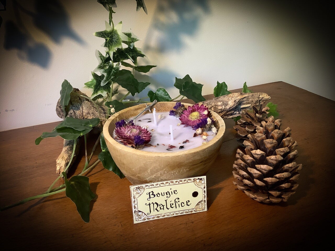 Bougie automnale * Maléfice * 350 gr Arômes : en notes de tête lavande , pinpailletée mica naturel , pigment de couleur végétal