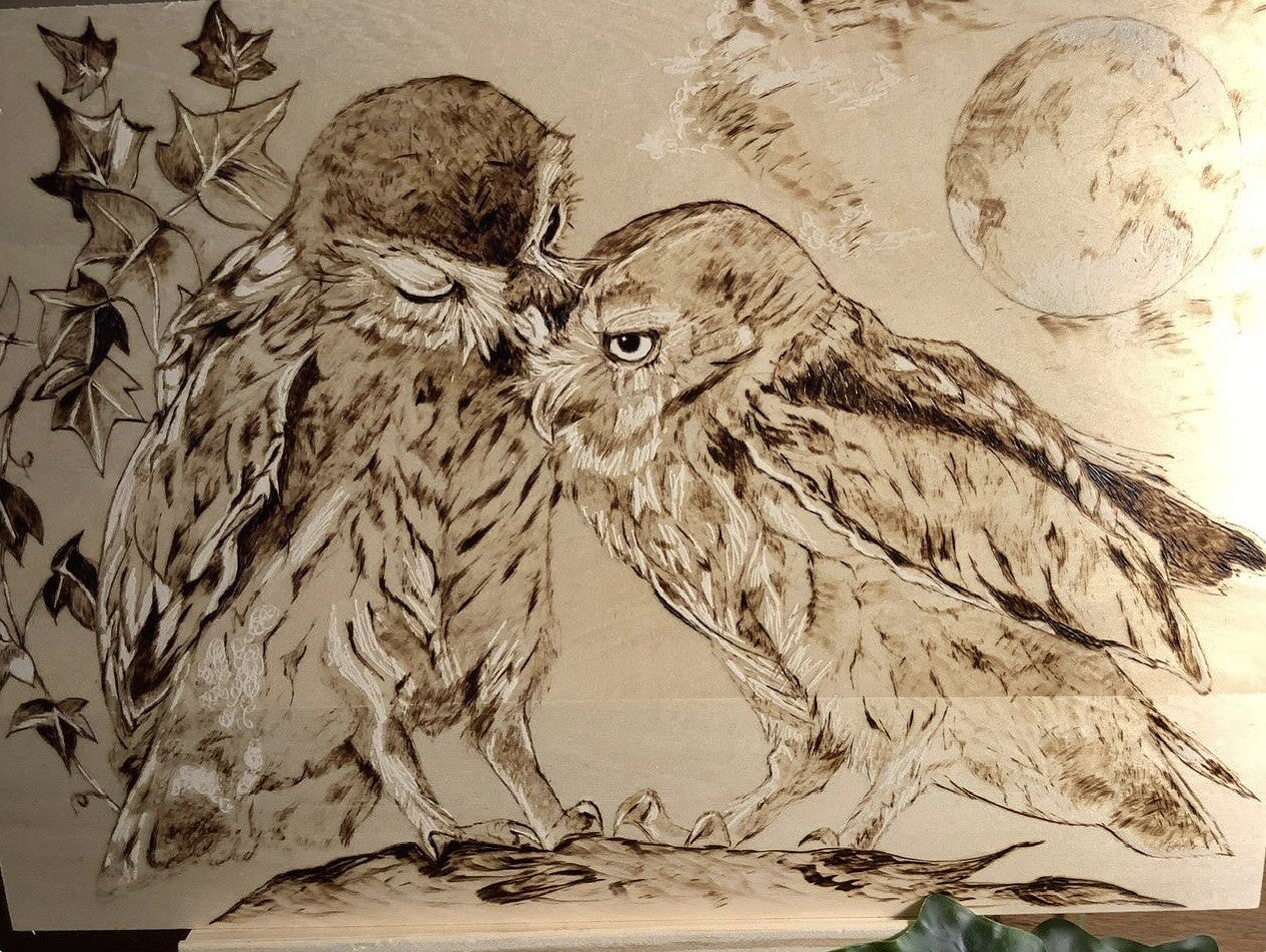 Pyrogravure * chouettesTableau bois Illustration huilée pour la protection du dessin 30/20 cm Se pose sur un chevalet ou s’accroche au mur ( accroche incluse
