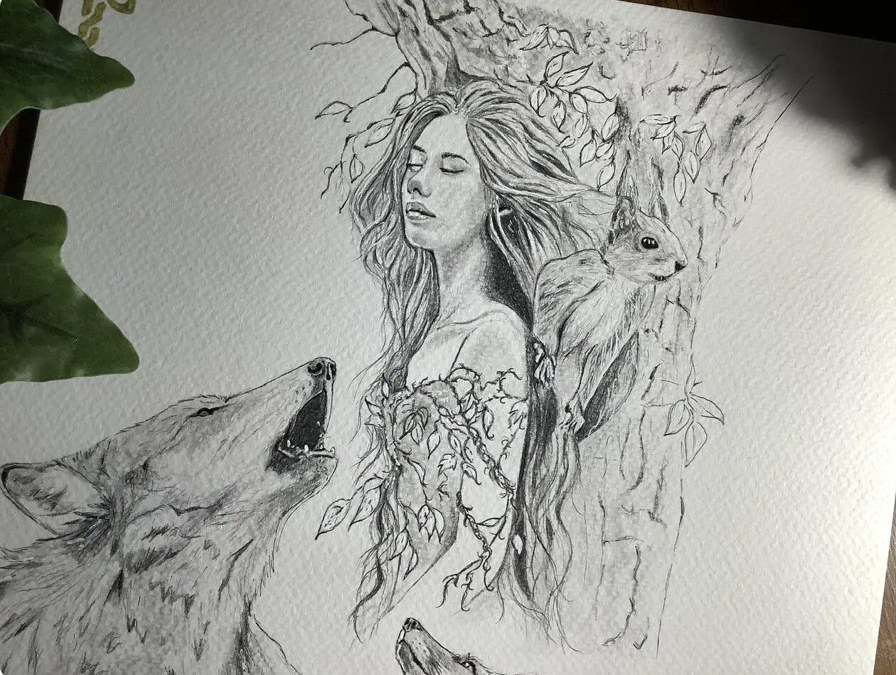 Illustration original * l’âme de la forêt Fait au graphite Sur papier aquarelle blanc 300grFormat 25/25 cmFixatif pour la tenue du dessin