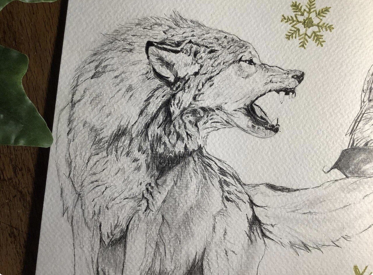 Illustration originale * loup et chouette Fait au graphiteSur papier aquarelle blanc 300grFormat 25/25 cmFixatif pour la tenue du dessin
